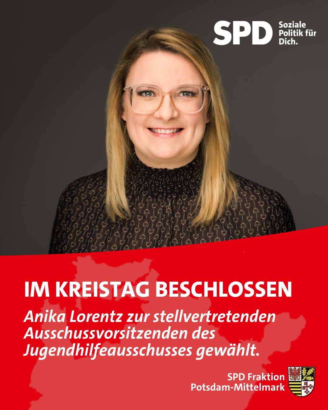Der Kreistag Potsdam-Mittelmark hat in seiner Sitzung am 09.10.2025 unsere stellvertretende Fraktionsvorsitzende, Anika Lorentz, zur neuen Stellvertreterin des Vorsitzenden für den Jugendhilfeausschuss gewählt.